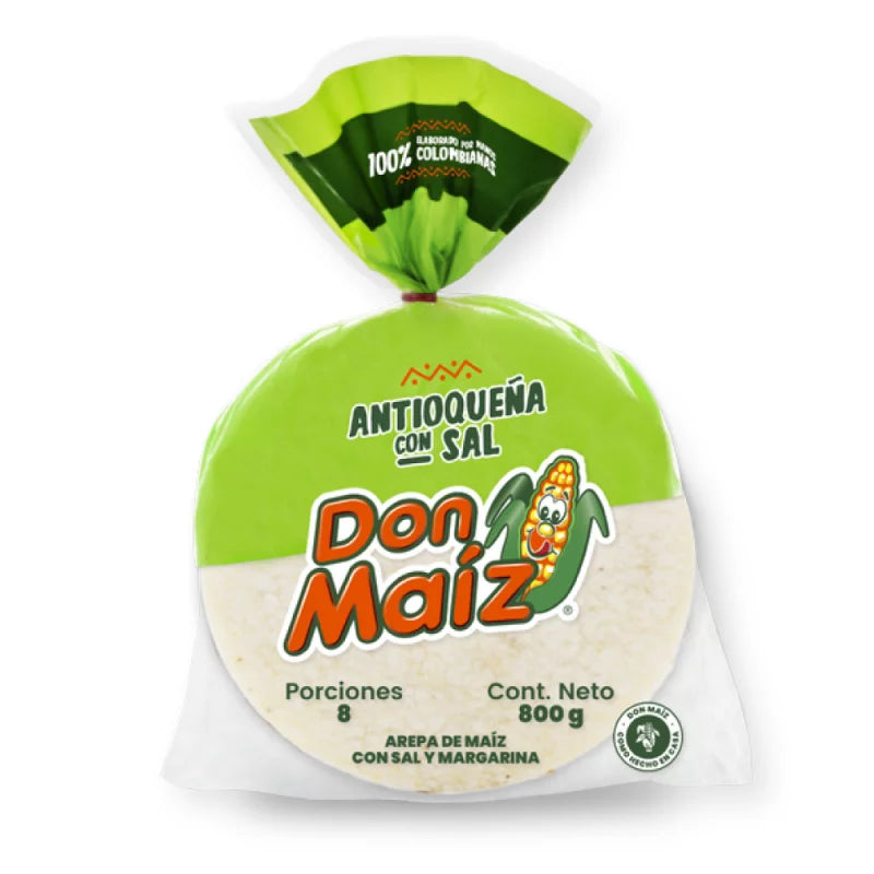 DON MAIZ AREPA ANTIOQUENA SALT 8UND / 800G. Category: Frozen Foods. Package size: 800G.