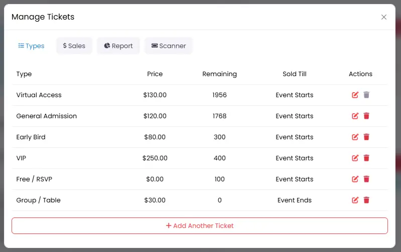 - Ticket Types (General, VIP, Early Bird, Group, Free, etc.)