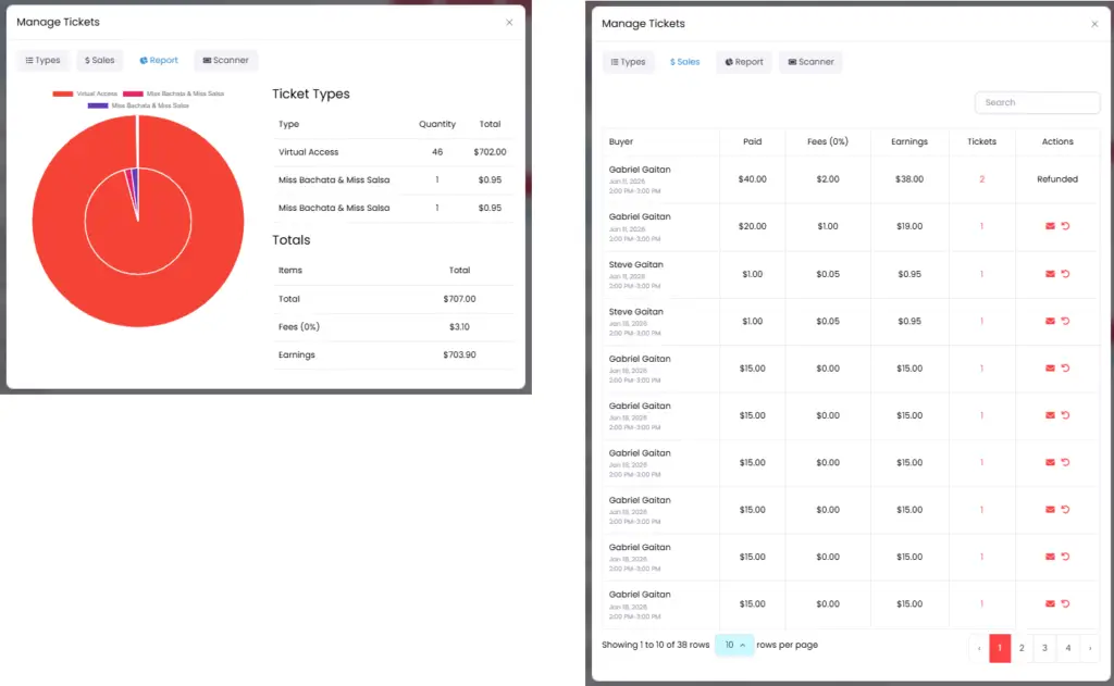 - Filter by buyer, ticket type, or transaction