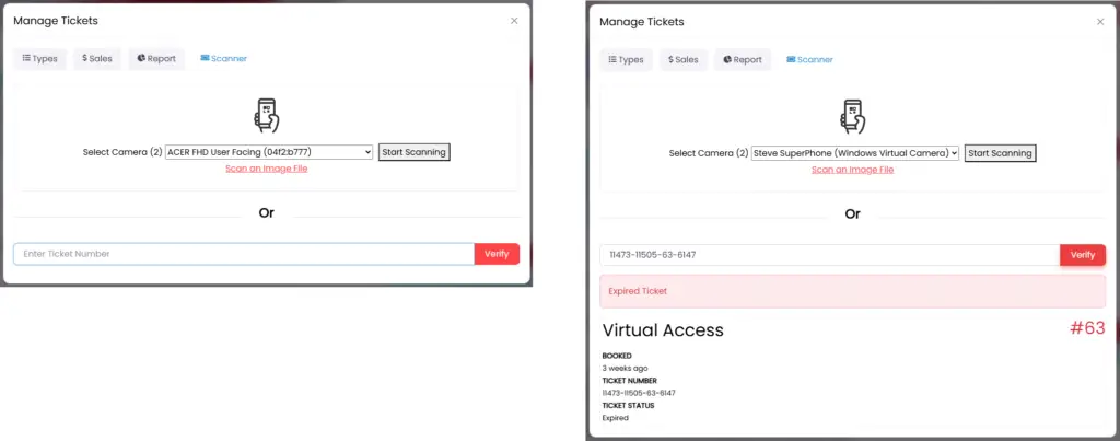 Use the built-in QR scanner or enter ticket numbers manually:
